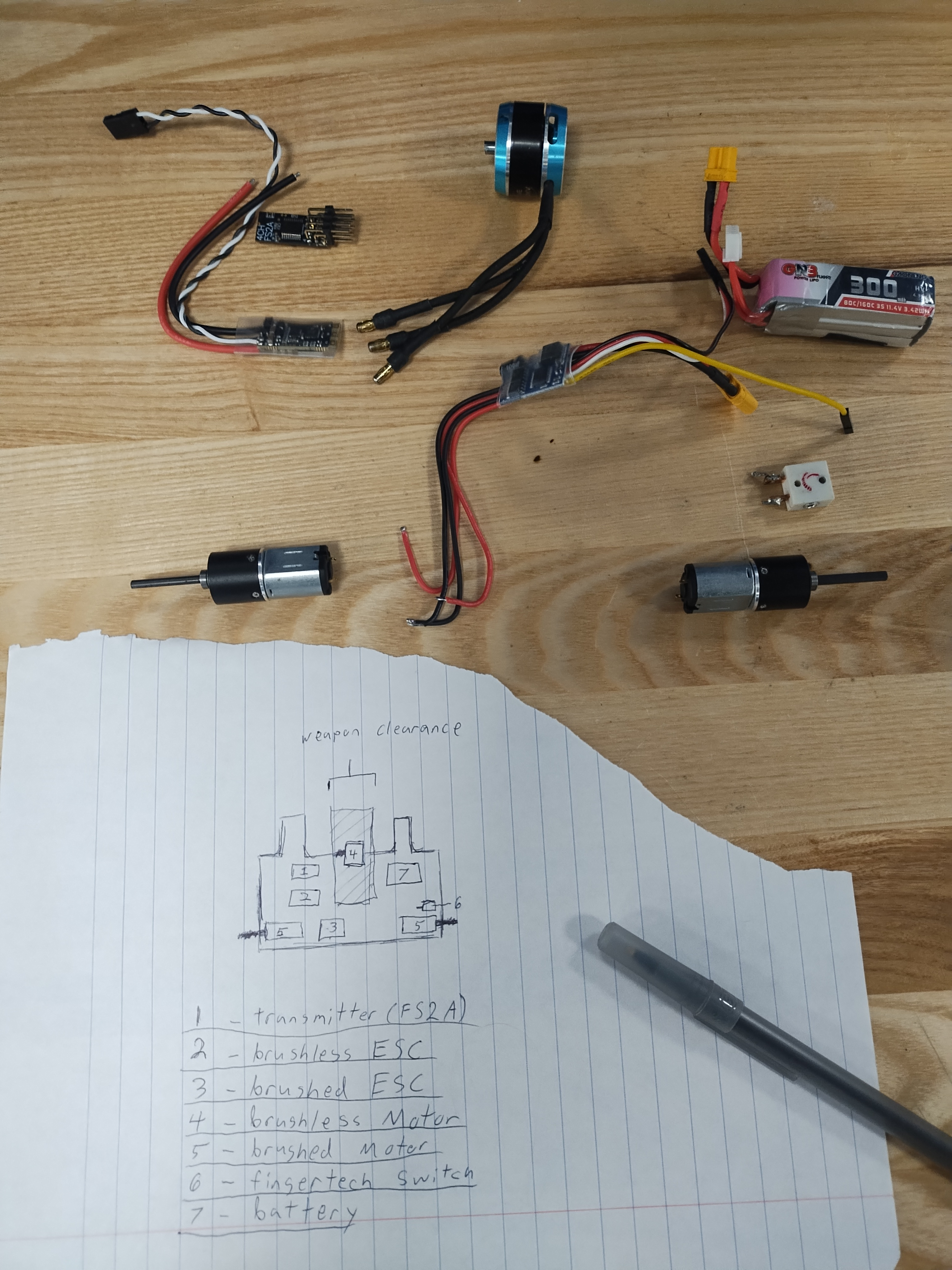The design work was done in OnShape, an open-source, cloud/browser-based, CAD software (Compatibility with Linux is the main reason I chose to use it). I spent a few months with the club learning the basics of the program and general design of a Combat Bot. The electronics are simple enough. It's a lot like a like a standard RC-Car, on steroids... This tutorial will be over building a basic 1lb Plastic AntWeight (PLANT), Vertical Spinner: https://battlebots.fandom.com/wiki/Vertical_Spinners
